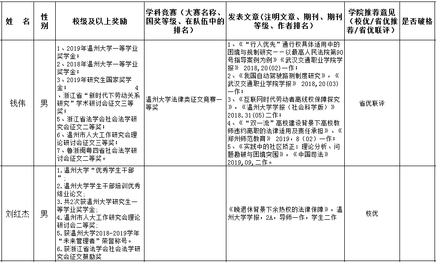 为鼓励和引导广大研究生健康发展、全面成才,根据《温州大学研究生优秀毕业生评选办法》》(行政〔2019〕225号)文件精神,经麻将胡了试玩 通知、学生申请、麻将胡了试玩 组织评审,现推荐麻将胡了试玩 2017级研究生钱伟参加学校组织的省级优秀毕业生联评(学校再次组织评审),推荐2017级研究生刘红杰参加校级优秀毕业生评选(学校审核)。学生的基本情况如下: