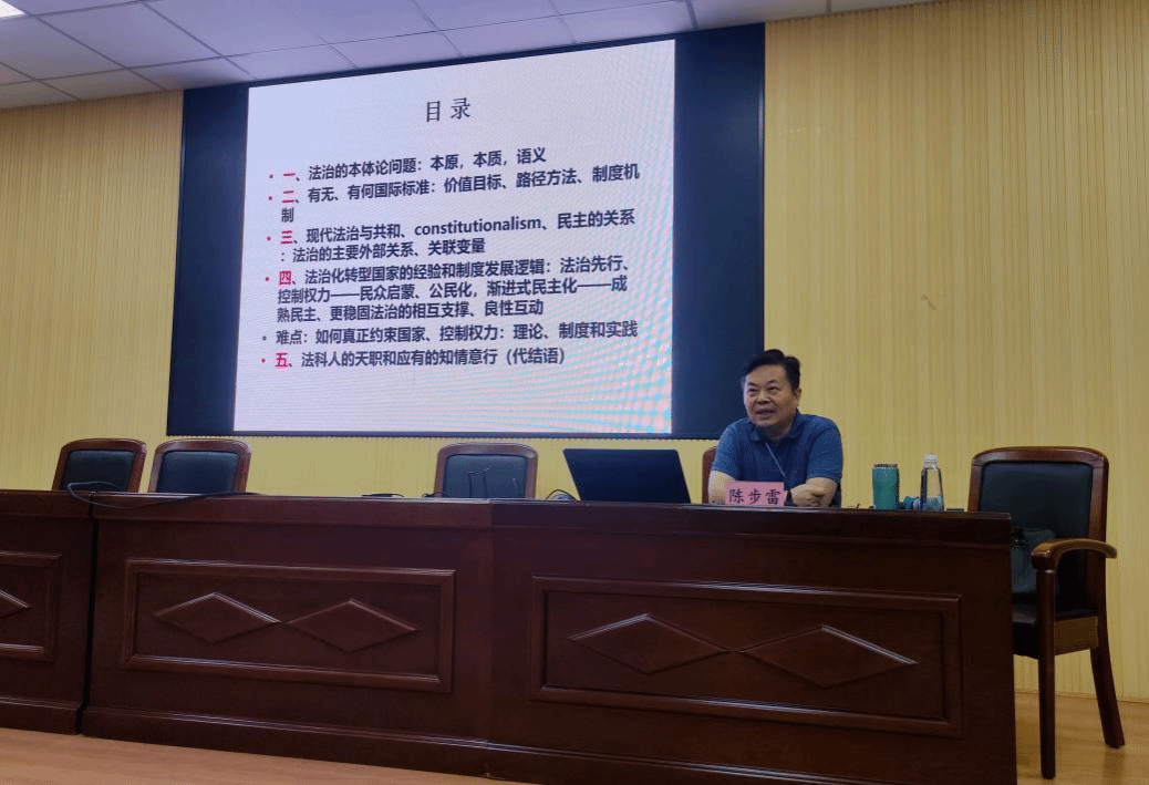 陈步雷教授以法治的本体论问题作为切入点,和同学们解释了法治的含义,说明了法治与共和、民主的关联,指出了转型国家面临的主要挑战,并及结合自己观点为同学们总结了法治转型国家的经验与教训。