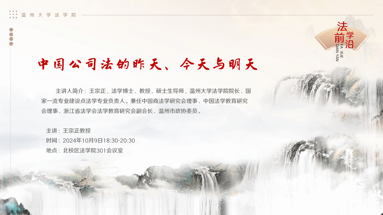 讲座预告|10月9日法学前沿第4讲:中国公司法的昨天、今天与明天(主讲人:王宗正)