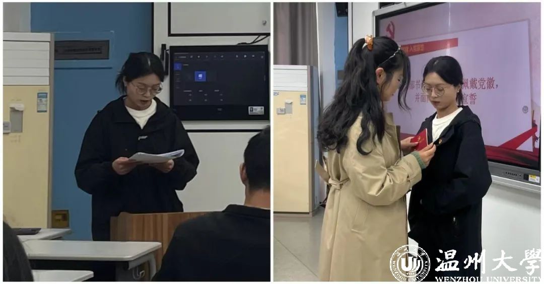 预备党员接收大会结束之后,支部书记杨钰莹同志为汪欢同志佩戴党员党徽、颁发《中国共产党章程》并带领入党宣誓。辅导员谢亭立老师借此勉励全体党员坚守初心,践行全心全意为人民服务的宗旨。