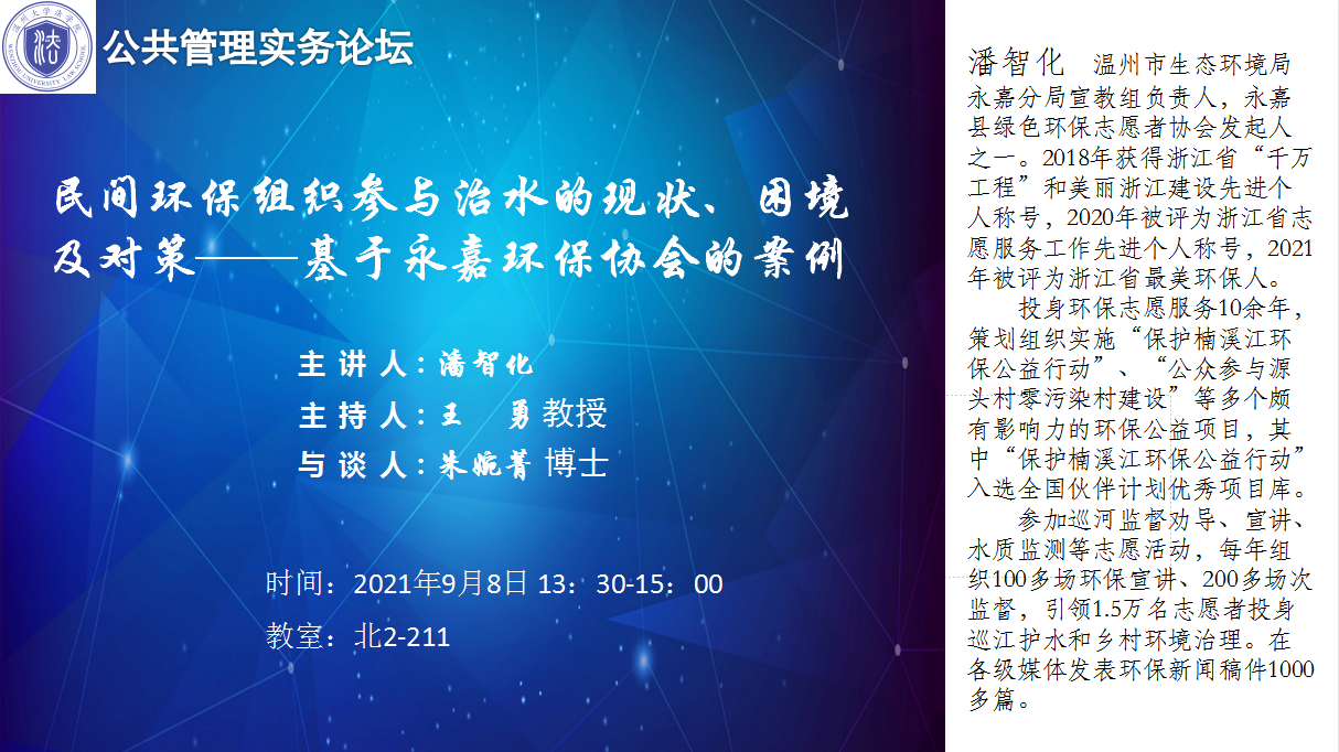公共管理实务论坛预告——“民间环保组织参与治水的现状、困境及对策——基于永嘉环保协会的案例”