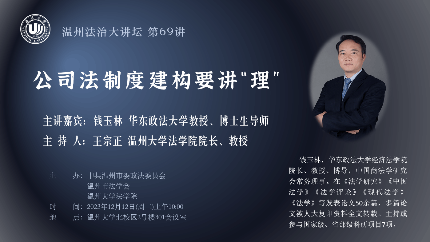 讲座预告丨温州法治大讲坛 第69讲:公司法制度建构要讲“理”