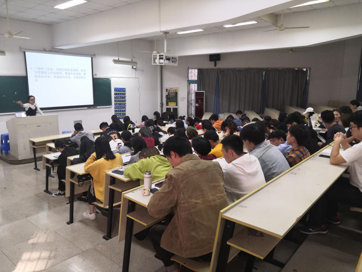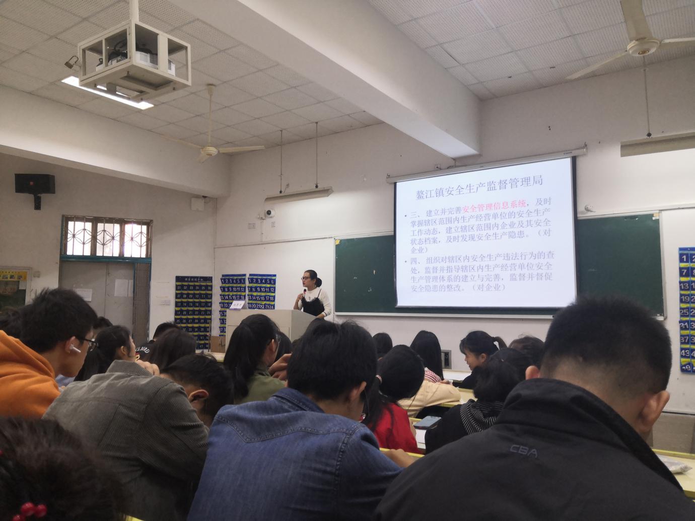 在讲座中,池思思老师围绕近期典型案例的导入、安监局的部门职责、基层安全管理工作开展的重点内容、近十年的工作经验与想法等四个方面展开了分享。首先,池老师从各地区因疏忽造成的几例安全事故出发,引出基层安监工作的重要性,随后对消防逃生的安全常识进行了科普。接着,她概括了平阳县鳌江镇安监局的具体职能,详细介绍了该部门全面贯彻安全生产方法和浙江省安全生产条例、进行责任制目标考核、建立完善安全管理信息系统、查处违法行为等具体职能范围。池老师着重点明基层行政管理工作应以做好本职工作为前提,阐明基层安全管理工作最主要的是底数清和抓重点。讲座过程中,池老师通过一张漫画与同学们进行了互动交流。在座同学踊跃发言,指出漫画中的违章现象,现场气氛热烈。最后,池老师提出了基层工作者应明确职责,具备高情商、高学习能力、高业务能力的要求,在座师生纷纷表示受益匪浅。