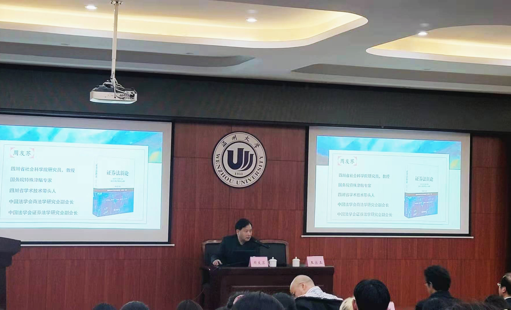 2020年11月24日晚,温州法治大讲堂第58讲在北校区3号楼203报告厅举行。四川省社会科麻将胡了试玩 研究员、中国法学会商法学研究会副会长、中国法学会证券法学研究会副会长周友苏为温州大学师生解读新《证券法》。本次温州大讲坛由温州市政法委、温州市法学会、温州市律师协会及麻将胡了试玩(中国)官方网站 主办,温州大学私法研究中心、温州大学民商法创新团队协办。麻将胡了试玩(中国)官方网站 师生近300人聆听了本次讲座。