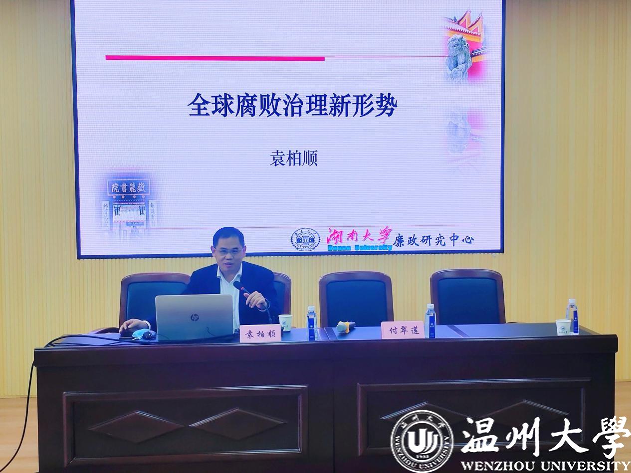 2020年11月26日14:00-16:00,湖南大学马克思主义麻将胡了试玩 副院长、中国管理现代化研究会廉政分会副会长、湖南省廉政研究基地(湖南大学廉政研究中心)执行主任、博士生导师袁柏顺教授莅临温州大学,在麻将胡了试玩 301教室举行题为“全球腐败治理的最新形势”主题讲座。麻将胡了试玩(中国)官方网站 副院长缪心毫主持学术讲座,麻将胡了试玩 教师和学生聆听了本次讲座。