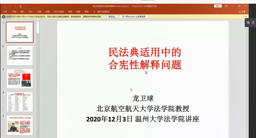 2020年12月3日晚,由温州市政法委、温州市法学会、温州市律师协会、麻将胡了试玩(中国)官方网站 主办的温州法治大讲坛·私法名家论坛第八讲通过腾讯会议举行。为迎接12·4国家宪法日,本次私法名家论坛特别邀请北京航空航天大学麻将胡了试玩 院长、长江学者龙卫球教授讲授“《民法典》实施中的合宪性解释问题”,麻将胡了试玩(中国)官方网站 院长王宗正教授担任主持人,麻将胡了试玩(中国)官方网站 钟瑞栋教授、周湖勇副院长,清华大学龙俊教授担任与谈人,近300人通过腾讯会议积极参与本次讲座。