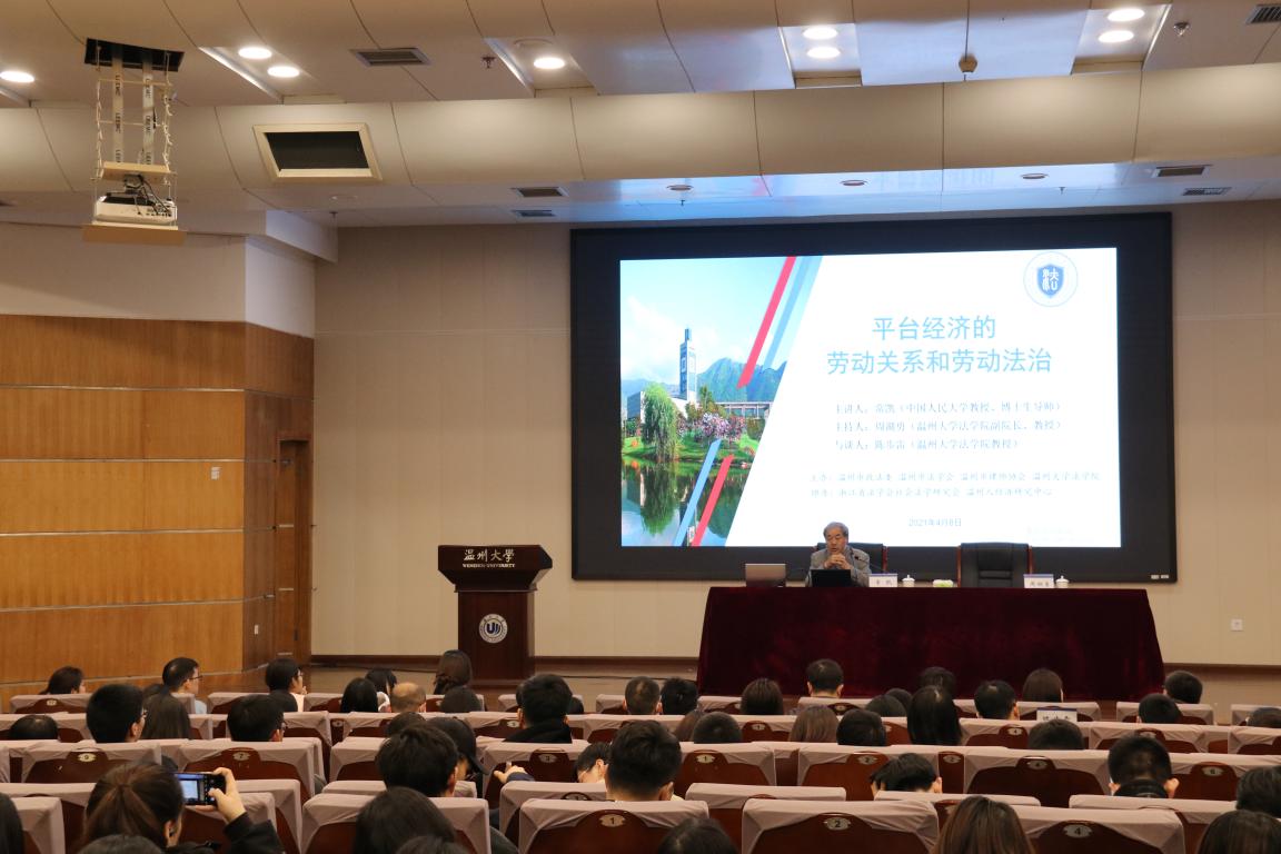 2021年4月8日晚,温州法治大讲坛在温州大学北校区信息楼报告厅隆重开讲,本次大讲坛特别邀请到中国人民大学常凯教授讲授《平台经济的劳动关系和劳动法治》。常凯教授是中国劳动关系研究会名誉会长,中国社会法研究会副会长,受邀来温讲学引起温州大学校内外强烈关注。