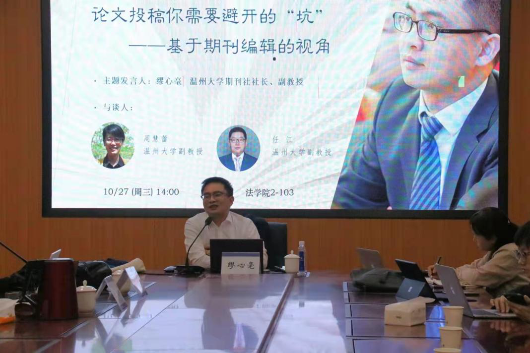 10月27日下午,第七期罗山法学研习社在北校区二号楼103会议室举行。本期邀请温州大学期刊社缪心毫社长就“论文投稿你需要避开的坑——基于期刊编辑的视角”作主题发言,周慧蕾副教授、任江副教授担任与谈人,法律系主任何平副教授担任主持人,麻将胡了试玩 部分教师与研究生共50余人参加。