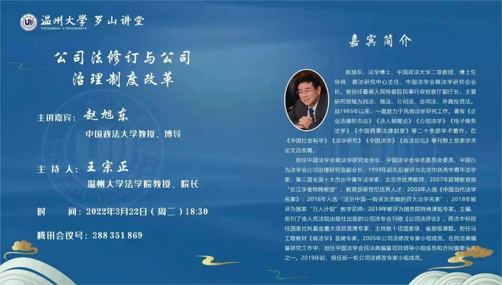 2022年3月22日晚,中国法学会商法学研究会会长、博士生导师、中国政法大学赵旭东教授作客温州大学罗山讲堂,为我校师生作题为《公司法修订与公司治理制度改革》的讲座。麻将胡了试玩(中国)官方网站 院长王宗正教授担任主持人,赵金龙教授、李勇军副教授担任与谈人。因疫情原因,讲座采取线上线下相结合的方式进行,300余人参加讲座交流。
