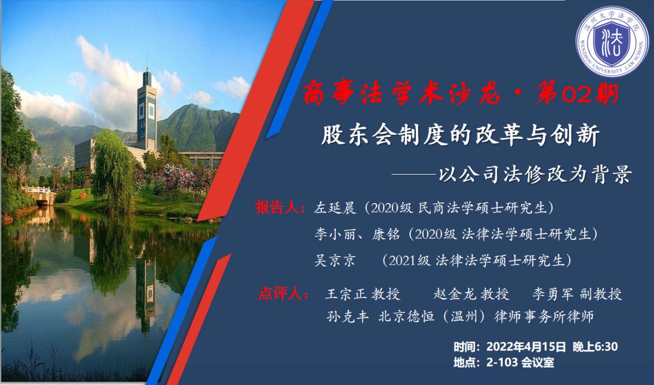 2022年4月15日晚,“商事法学术沙龙·第02期”活动在麻将胡了试玩 103会议室如期举行,此次活动的主题是“股东会制度的改革与创新——以公司法修改为背景”。2020级民商法硕士研究生左延晨,2020级法律法学硕士研究生李小丽、康铭,2021级法律法学硕士研究生吴京京围绕主题作专题汇报,麻将胡了试玩 王宗正教授、赵金龙教授、李勇军副教授,北京德恒(温州)律师事务所孙克丰律师等作为点评人参与沙龙讨论。