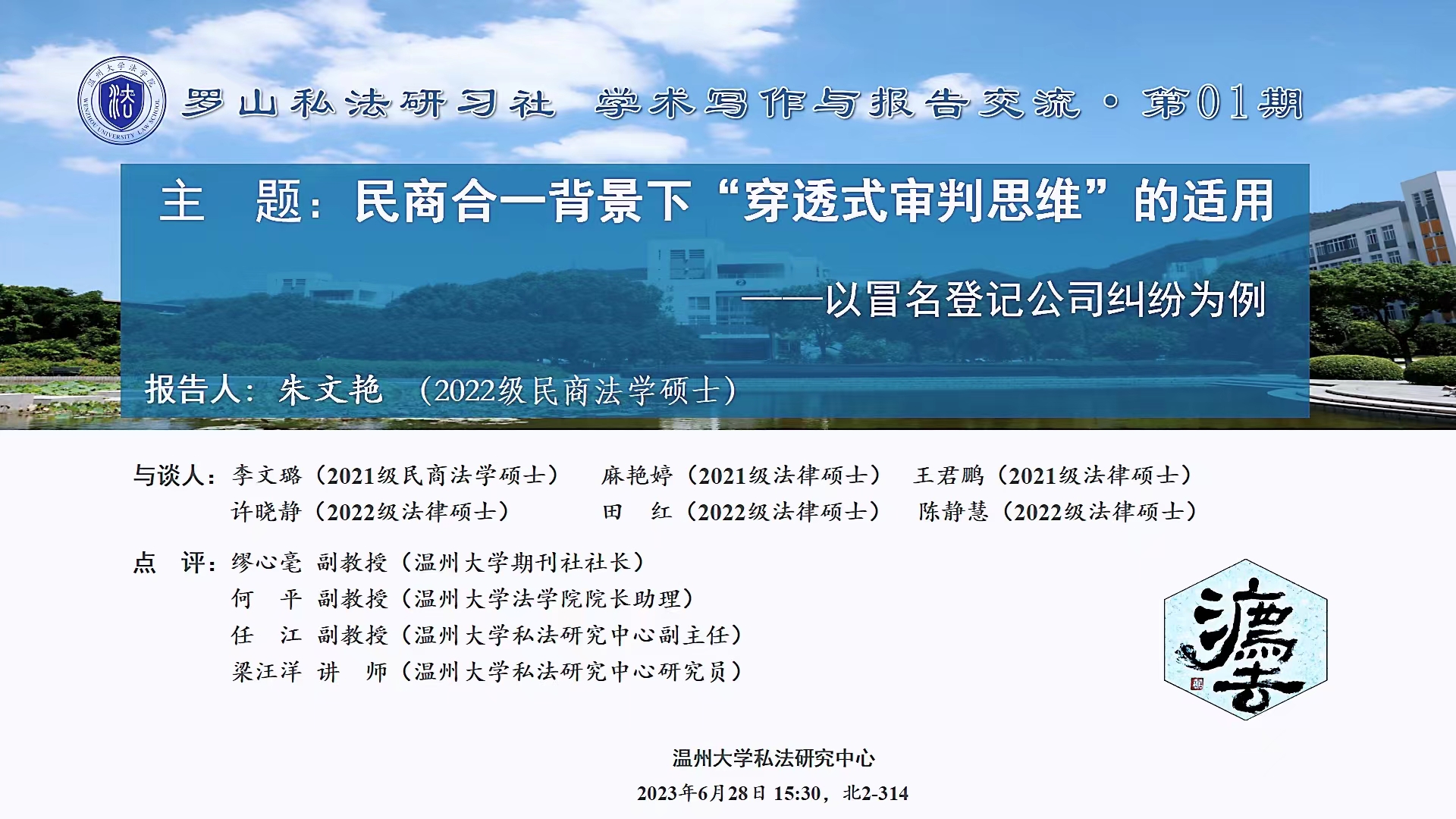 2023年6月28日下午,罗山私法研习社之学术写作与报告交流第01期在麻将胡了试玩 314会议室顺利举行。麻将胡了试玩 2022级民商法学硕士朱文艳,以“民商合一背景下‘穿透式审判思维’的适用——以冒名登记公司纠纷为例”为主题,通过线上和线下结合的方式,向与会老师和同学就自己同题目的论文作了相关报告。温州大学期刊社社长缪心毫副教授、麻将胡了试玩(中国)官方网站 院长助理何平副教授、温州大学私法研究中心副主任任江副教授、温州大学私法研究中心研究员梁汪洋讲师为点评人,麻将胡了试玩 2021级硕士研究生李文璐、麻艳婷、王君鹏,2022级硕士研究生许晓静、田红、陈静慧为与谈人。汇报论文的初稿已于一周前发给与谈同学与点评老师,与谈同学提前形成书面点评建议与意见,汇报结束后,由与谈同学和点评老师针对冒名登记公司的治理,论文的结构、内容、写作规范等发表意见。