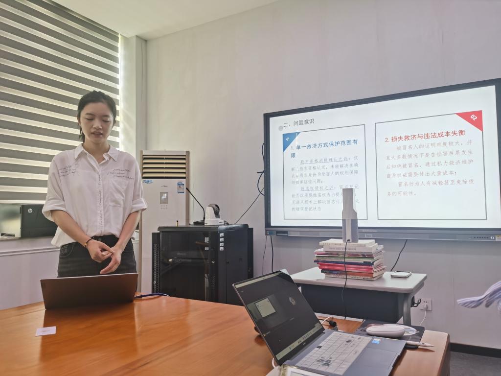 朱文艳同学首先介绍论文主要思路,即通过分析冒名登记案例发现司法实践中出现的问题,针对问题提出适用穿透式审判思维的前提、必要性和立体路径,实现高效化解冒名登记纠纷的目标。在此基础上,详细阐述了论文选题背景、问题意识、解决思路和写作疑问。
