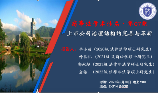 2023年5月30日,“商事法学术沙龙”第7期在麻将胡了试玩 314会议室如期举行,2020级硕士研究生李小丽,2021级硕士研究生仲昌礼、郭永超,2022级硕士研究生金铭、邵欣然参与汇报,李勇军老师以评议人身份参加沙龙活动。