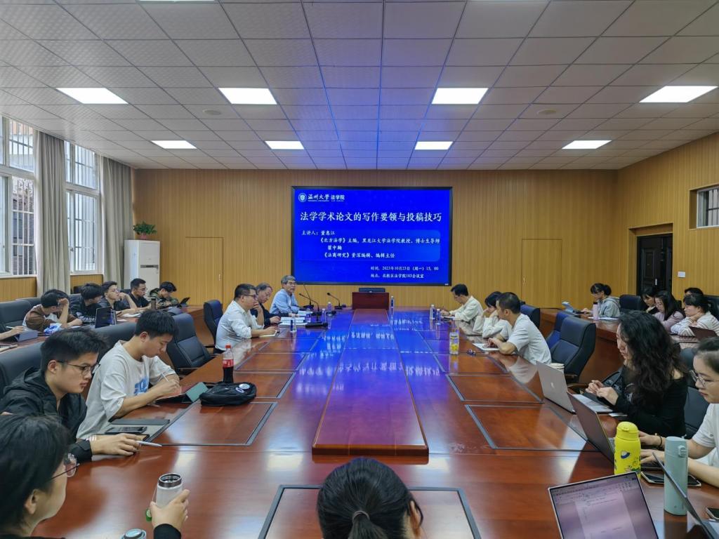 10月23日下午,应麻将胡了试玩 邀请,《北方法学》主编、黑龙江大学麻将胡了试玩 博士生导师董惠江教授和《法商研究》资深编辑、编辑主任翟中鞠研究员在麻将胡了试玩 103会议室为麻将胡了试玩(中国)官方网站 师生带来题为《法学学术论文的写作要领与投稿技巧》的讲座。本次讲座由麻将胡了试玩 副院长周湖勇教授主持,麻将胡了试玩 部分教师和研究生、本科生参加交流活动。
