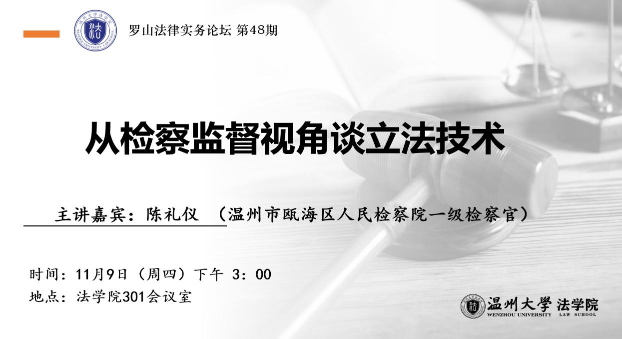 11月9日下午,温州市瓯海区人民检察院陈礼仪检察官应邀做客“第48期罗山法律实务论坛”,为麻将胡了试玩(中国)官方网站 师生作“从检察监督视角谈立法技术”的专题讲座。本次讲座由法学专业负责人、民商经济法系主任李勇军副教授主持,麻将胡了试玩 100余名同学参加讲座。