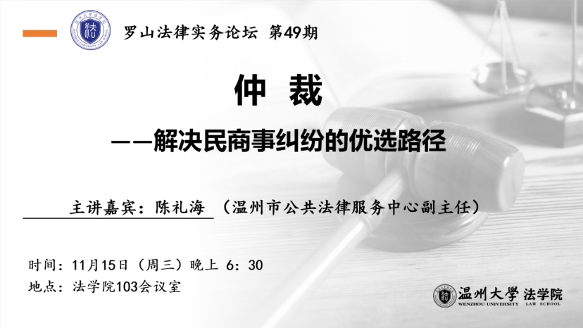 11月15日晚, “罗山法律实务论坛”第49期在麻将胡了试玩 103会议室开讲。此次活动邀请的主讲嘉宾是温州市公共法律服务中心陈海礼副主任,他主讲的题目为《仲裁——解决民商事纠纷的优选路径》。本次活动由法学专业负责人、民商经济法系主任李勇军副教授主持。
