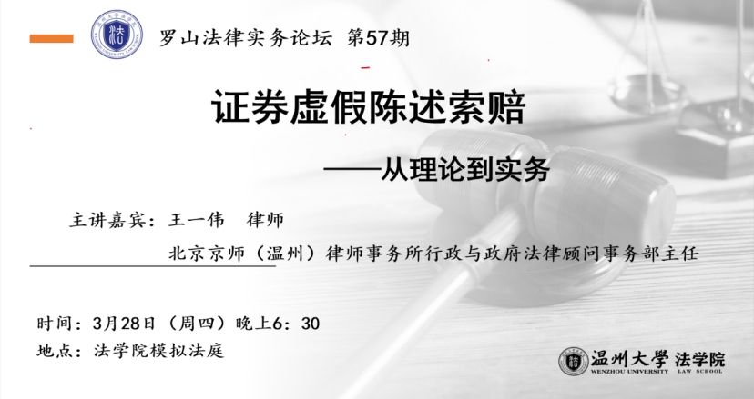 为拓宽学生们的律师职业视野、丰富法律实务经验,3月28日晚上,第57期“罗山法律实务论坛”在麻将胡了试玩 模拟法庭开讲,本次活动邀请到北京京师(温州)律师事务所王一伟律师为同学们开讲,主讲的题目为“证券虚假陈述索赔”,讲座由麻将胡了试玩 老师王海晶博士主持。