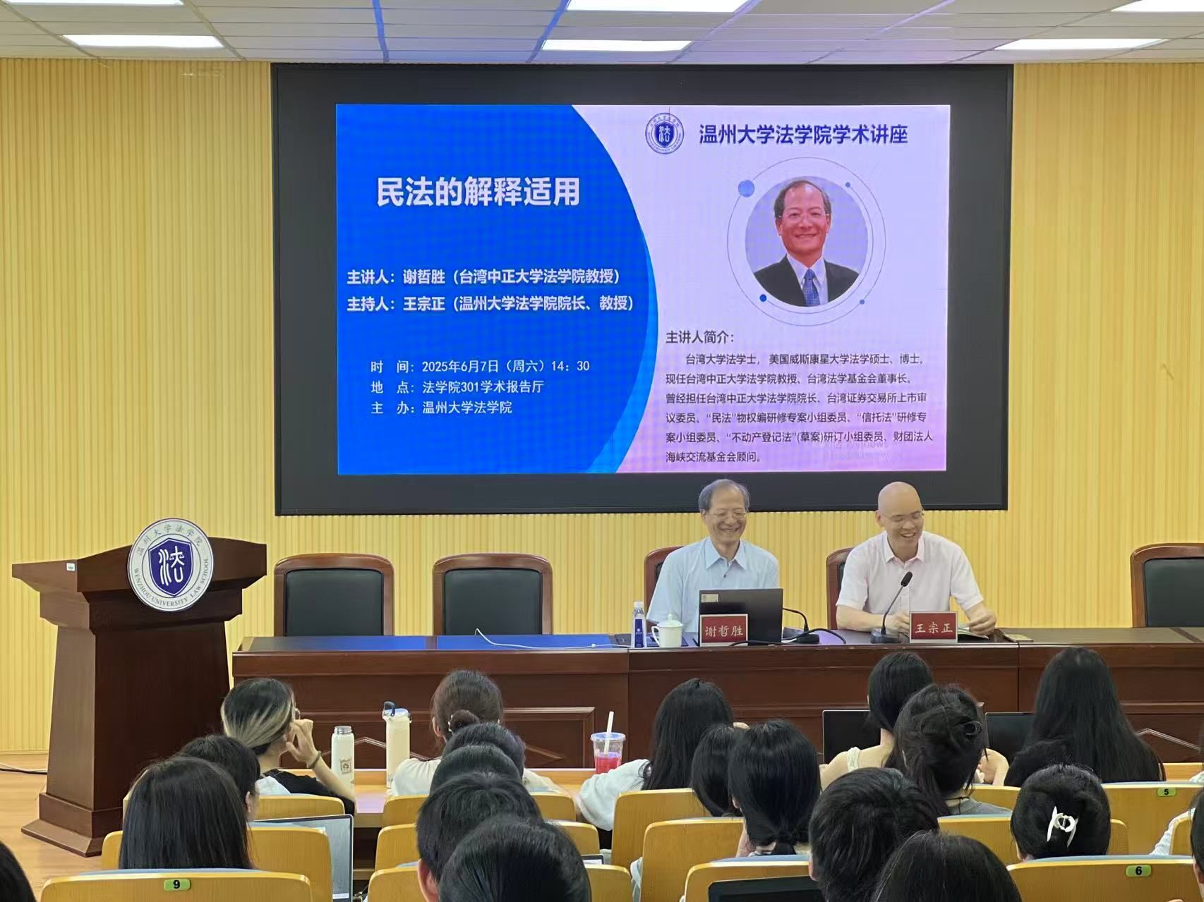 6月7日下午,由麻将胡了试玩 主办的学术讲座《民法的解释适用》在麻将胡了试玩 301学术报告厅热烈开讲。本次讲座特邀我国台湾中正大学麻将胡了试玩 教授、台湾法学基金会董事长谢哲胜先生主讲,麻将胡了试玩 院长王宗正教授主持并致欢迎词,吸引麻将胡了试玩(中国)官方网站 师生50余人积极参与。