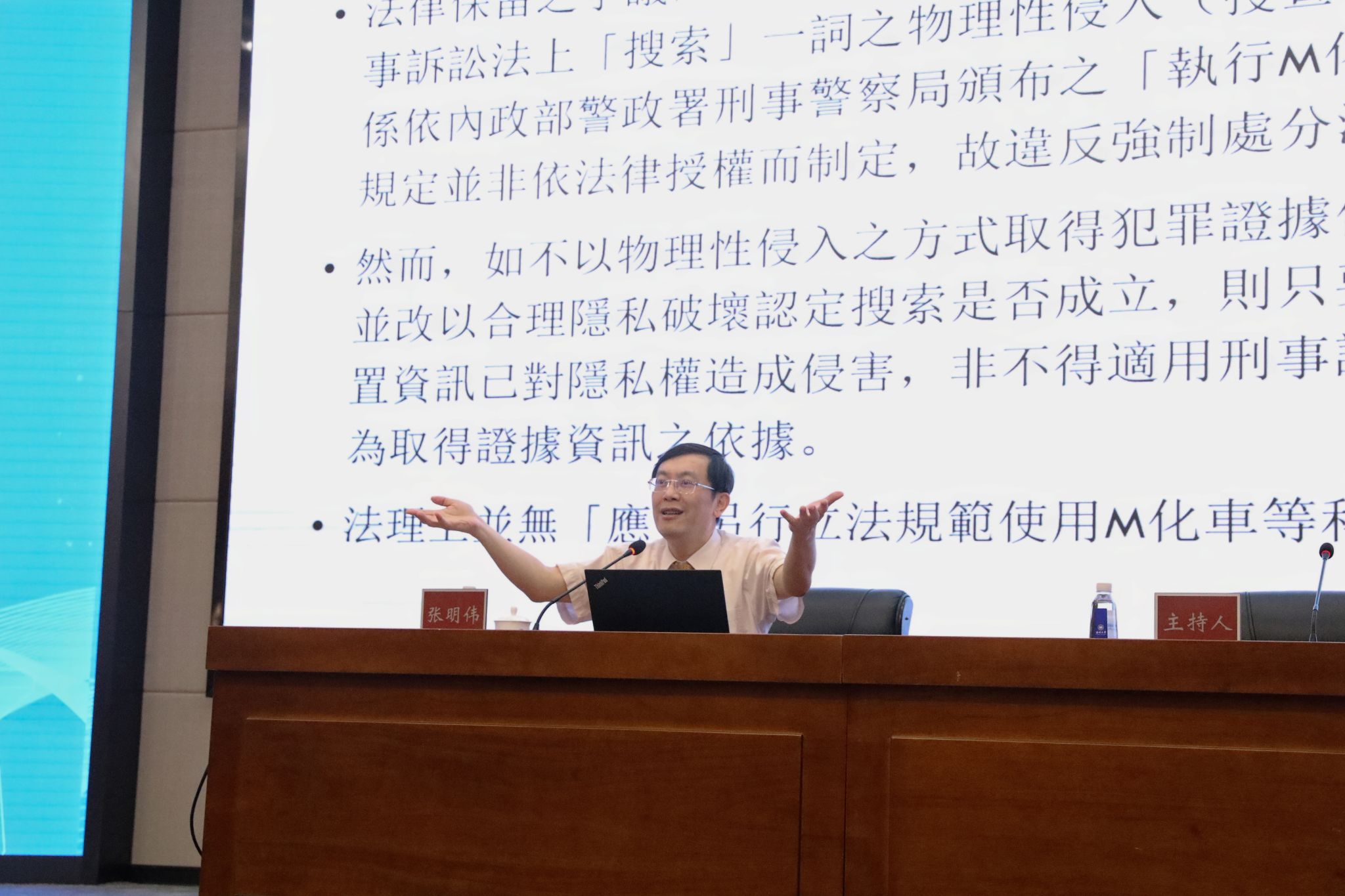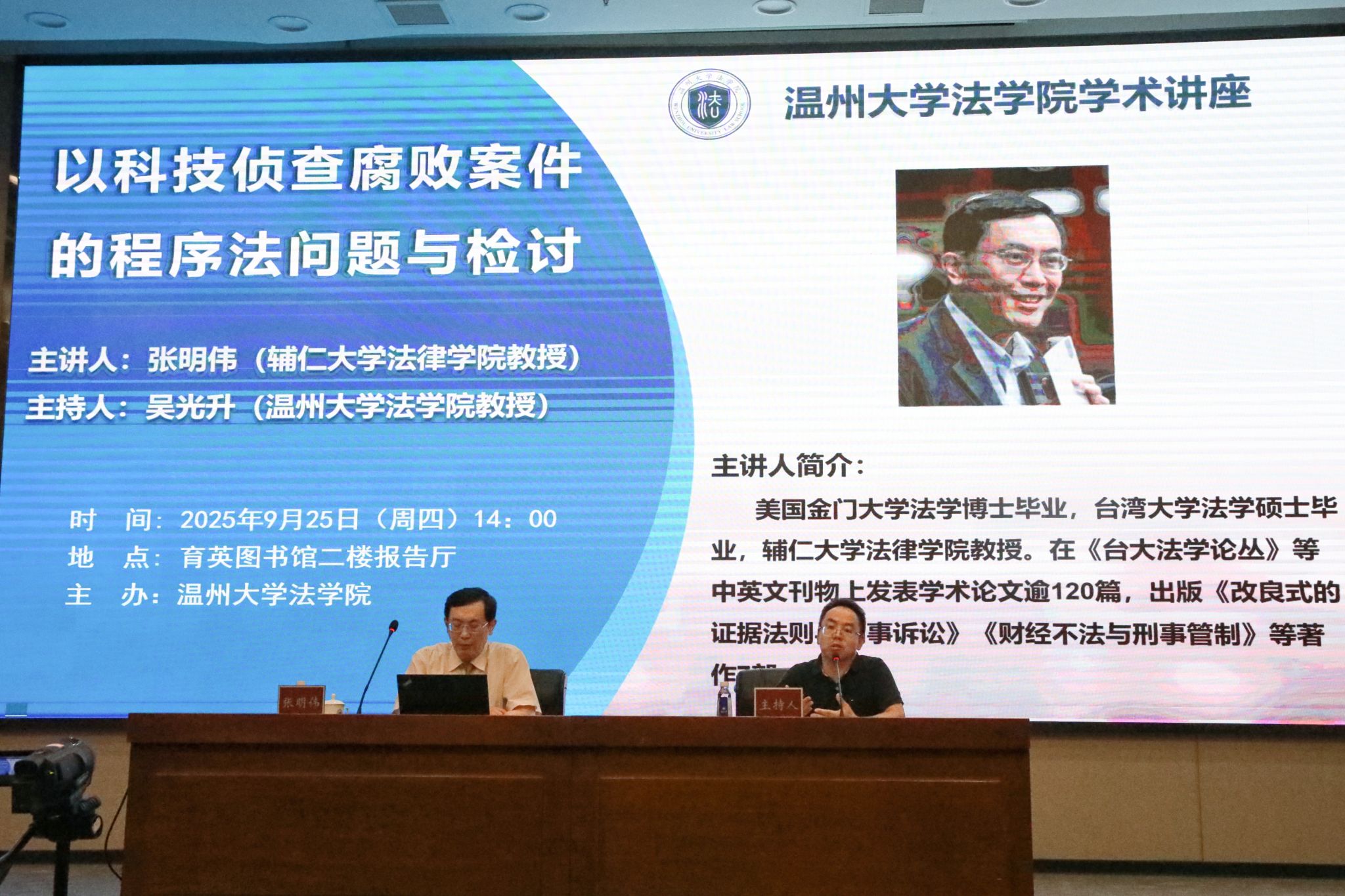 2025年9月25日下午,由麻将胡了试玩 主办的学术讲座《以科技侦查腐败案件的程序法问题与检讨》在育英图书馆二楼报告厅顺利举行。此次讲座特邀辅仁大学法律麻将胡了试玩 张明伟教授主讲,由麻将胡了试玩 吴光升教授主持并致欢迎词,吸引了众多师生到场聆听。