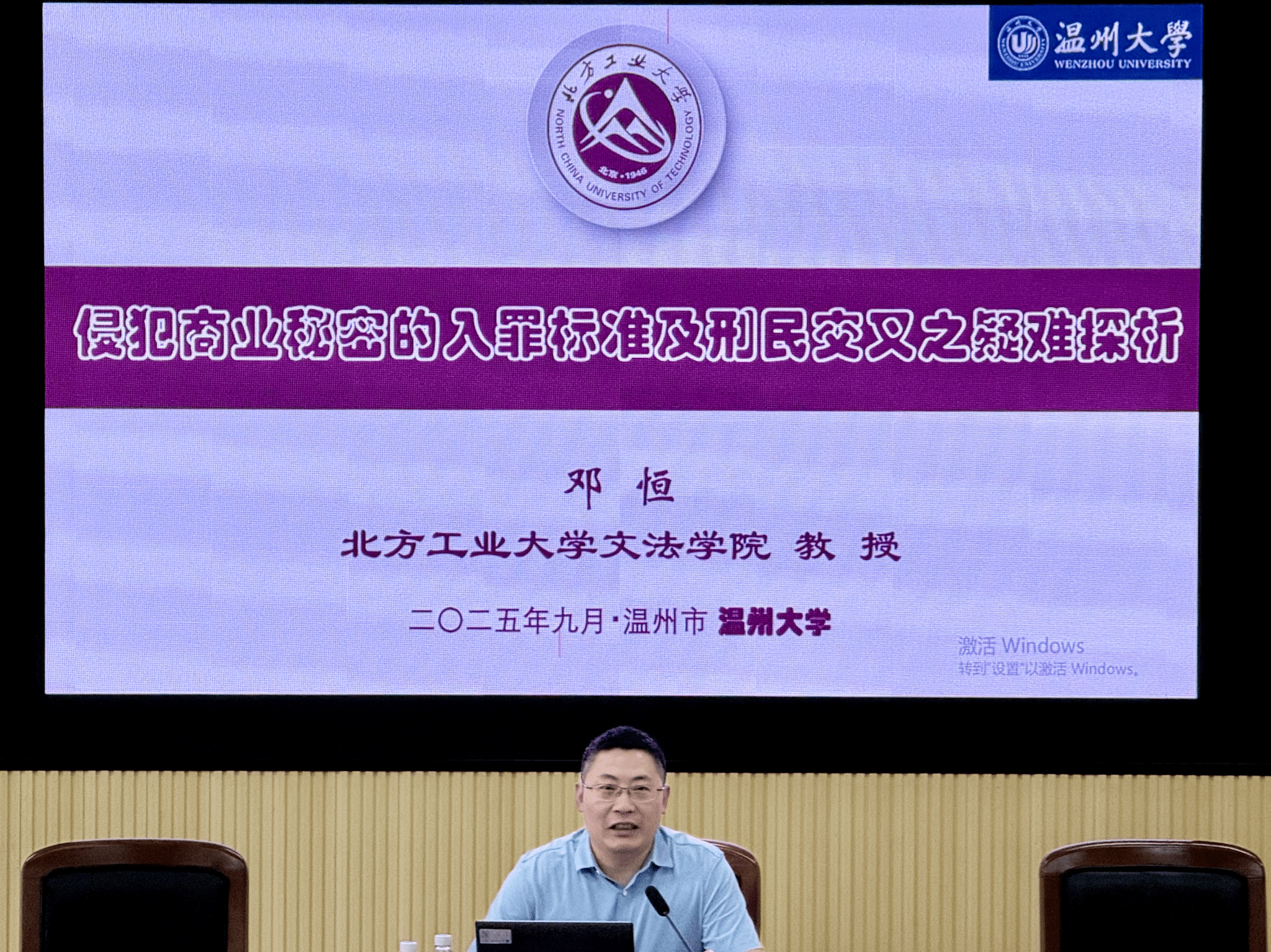 2025年9月18日下午,北方工业大学邓恒教授应邀在温州大学北校区麻将胡了试玩 301会议室作专题讲座《侵犯商业秘密的入罪标准及刑民交叉之疑难探析》。本次讲座吸引了众多师生到场聆听,现场氛围热烈。