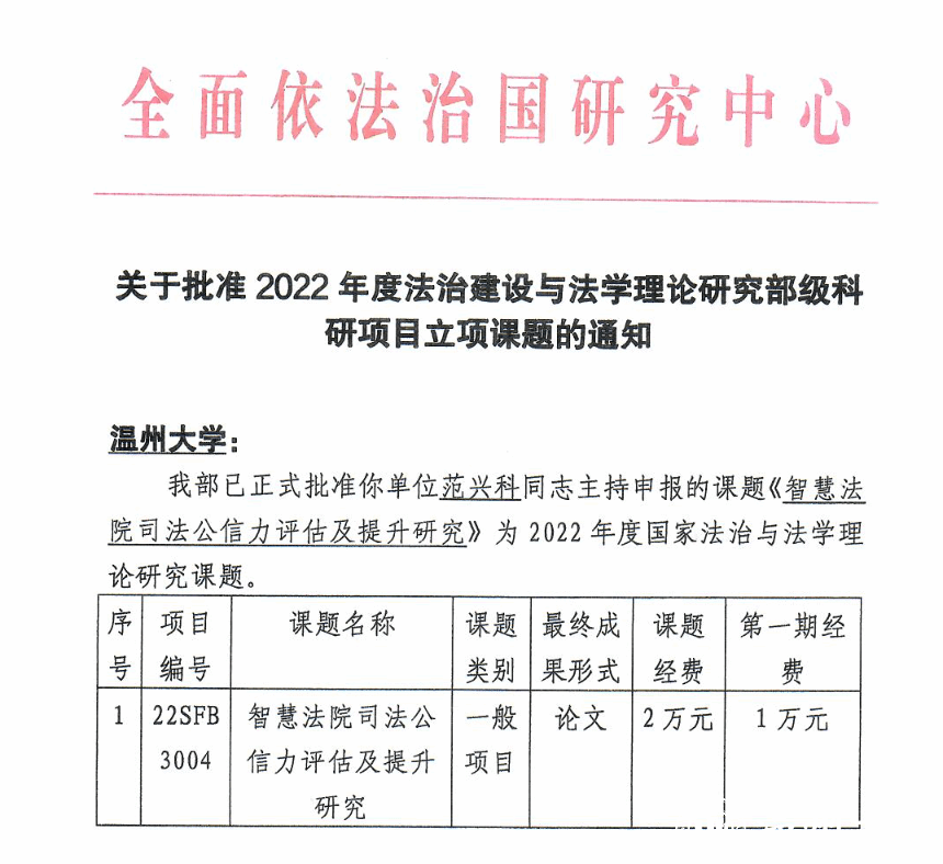 近日,司法部全面依法治国研究中心正式发布了司法部“法治建设与法学理论研究”部级科研项目立项课题的通知,麻将胡了试玩(中国)官方网站 范兴科老师主持的《智慧法院司法公信力评估及提升研究》获得立项。立项信息如下: