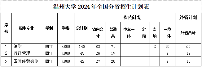 就业去向:学生就业面广,就业起点高、薪酬高,职业前景好、发展潜力大。毕业生就业去向包括政府部门、法院、检察院、律所、公证仲裁机构及大中型企业,就业质量居省内同类院校前列,法学专业被评为温州大学最具竞争力专业。学生升学表现优异,近年来有多名学生考入北京大学、中国人民大学、复旦大学、武汉大学、厦门大学、中国政法大学、中南财经政法大学等全国“双一流”大学以及华东政法大学、西南政法大学等知名政法院校,成功申请到美国宾夕法尼亚大学、南加州大学、乔治城大学、英国爱丁堡大学、澳大利亚莫纳什大学等海外知名高校继续深造。