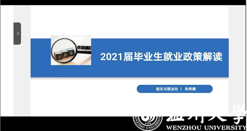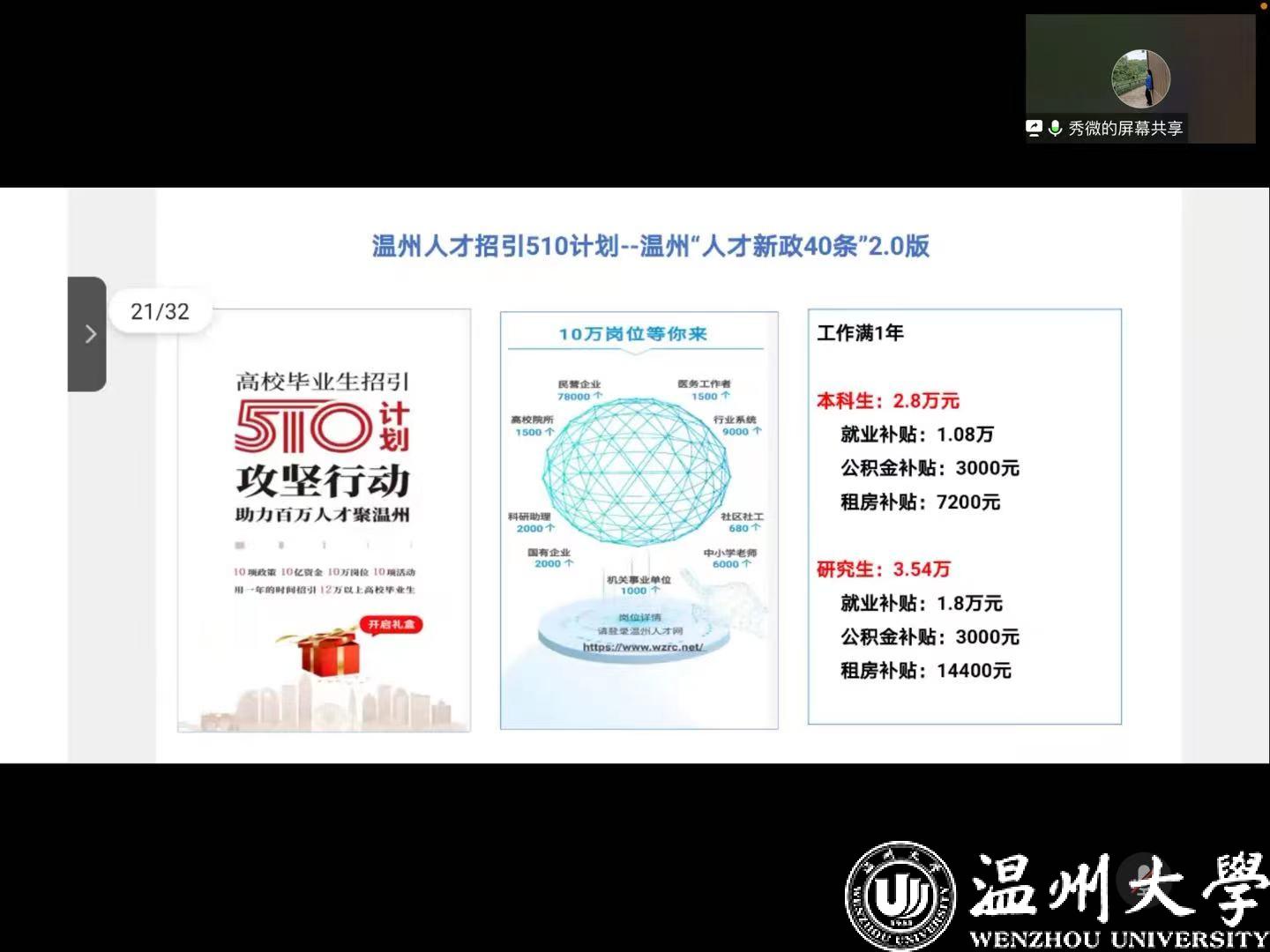 首先,朱秀微老师对2021届毕业生就业政策进行解读。她引入具体案例,分析了当前就业形势,提出疫情影响不确定性、“高期望”和“慢就业”加剧、新领域新业态从业人数增多等情况。她讲解了国家相关就业创业政策,建议毕业生们利用好国家相关就业网了解就业信息。她结合温州市510政策,鼓励更多毕业生学在温州,就业在温州。