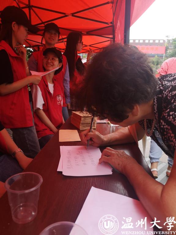 社区老人们为志愿者讲述过去的故事,感慨祖国发展的日新月异。一个奶奶驻足在志愿者帐篷前,用最质朴的文字写下了对祖国的深情祝福:“热烈庆祝中华人民共和国成立70周年!祝祖国母亲繁荣昌盛,祖国母亲万岁!”。志愿者们将一封封祝福投入信封箱,让一份份祝福永远珍藏。“你们有纸质版的知识题库吗,我想带回家好好学习,活到老,学到老。”社区的奶奶向志愿者们询问道。