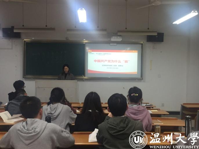 活动全程围绕“中国共产党为什么‘能’”展开,谢亭立老师用从生存根基(无私底色)、理论指导(核心基因)、内在机制(鲜明特征)三个方面为党员同志们阐释了中国共产党“能”的原因。从中国共产党党员人数由1921年的50人变为2019年的9000多万人;从1945年的用民主打破“历史周期率”到2019年从人民利益出发的自我革命;从坚定信仰马克思主义真理到把马克思主义同中国国情相结合,走出中国特色社会主义道路;从延安整风运动到党风廉政建设、三严三实、两学一做。从而得出了中国共产党确实“能”、永远“能”的结论。