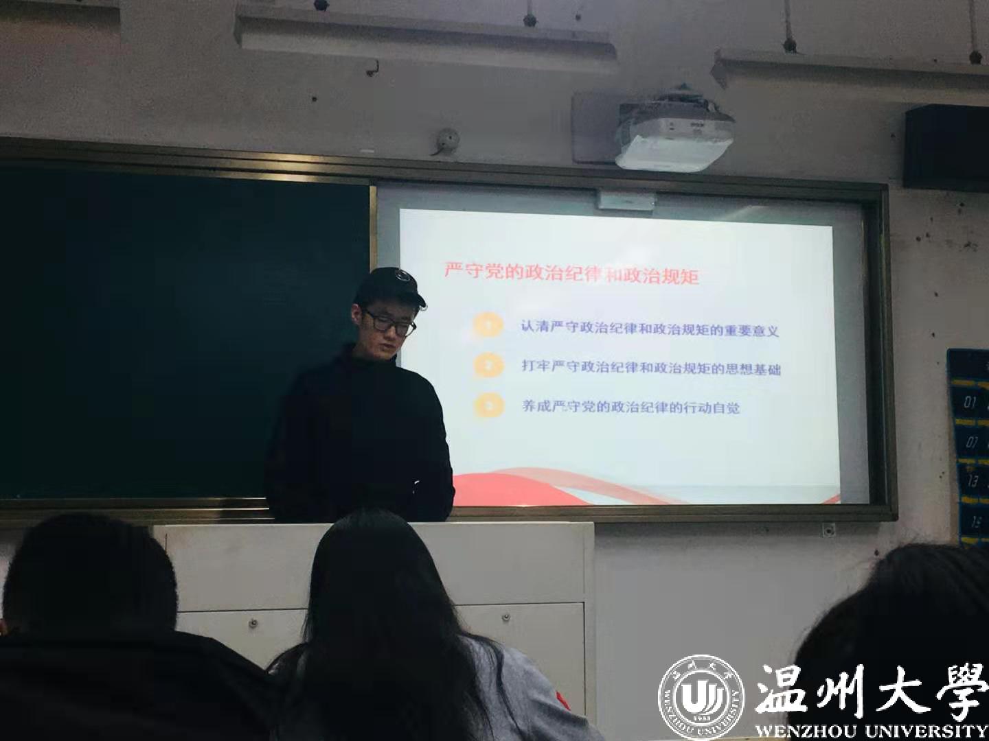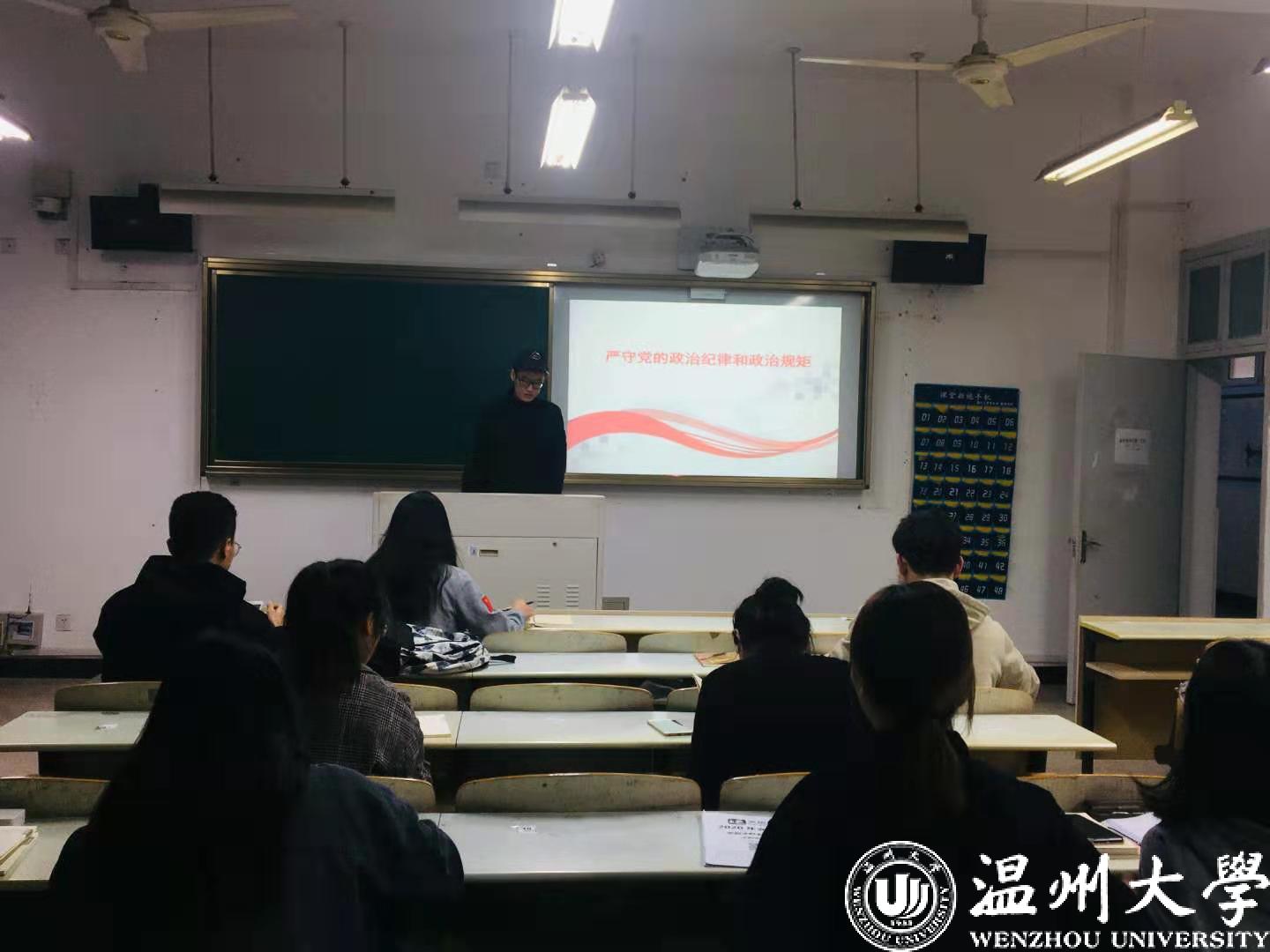 为深入贯彻“不忘初心、牢记使命”主题教育总要求,学生第一党支部于2019年11月12日晚在麻将胡了试玩 310教室开展了专题学习活动。支部同志葛致远和吴成围绕“严守党的政治纪律和政治规矩”向支部全体党员开展了专题报告。