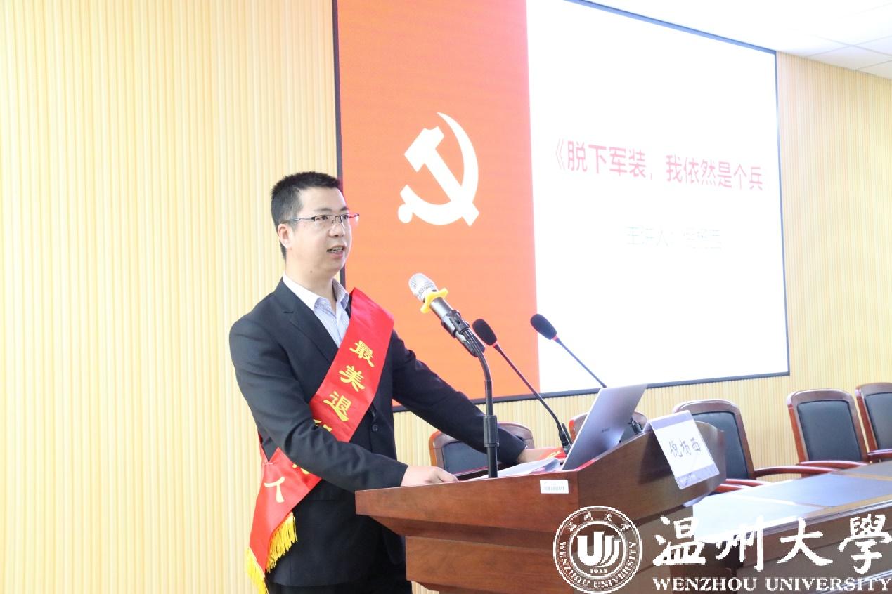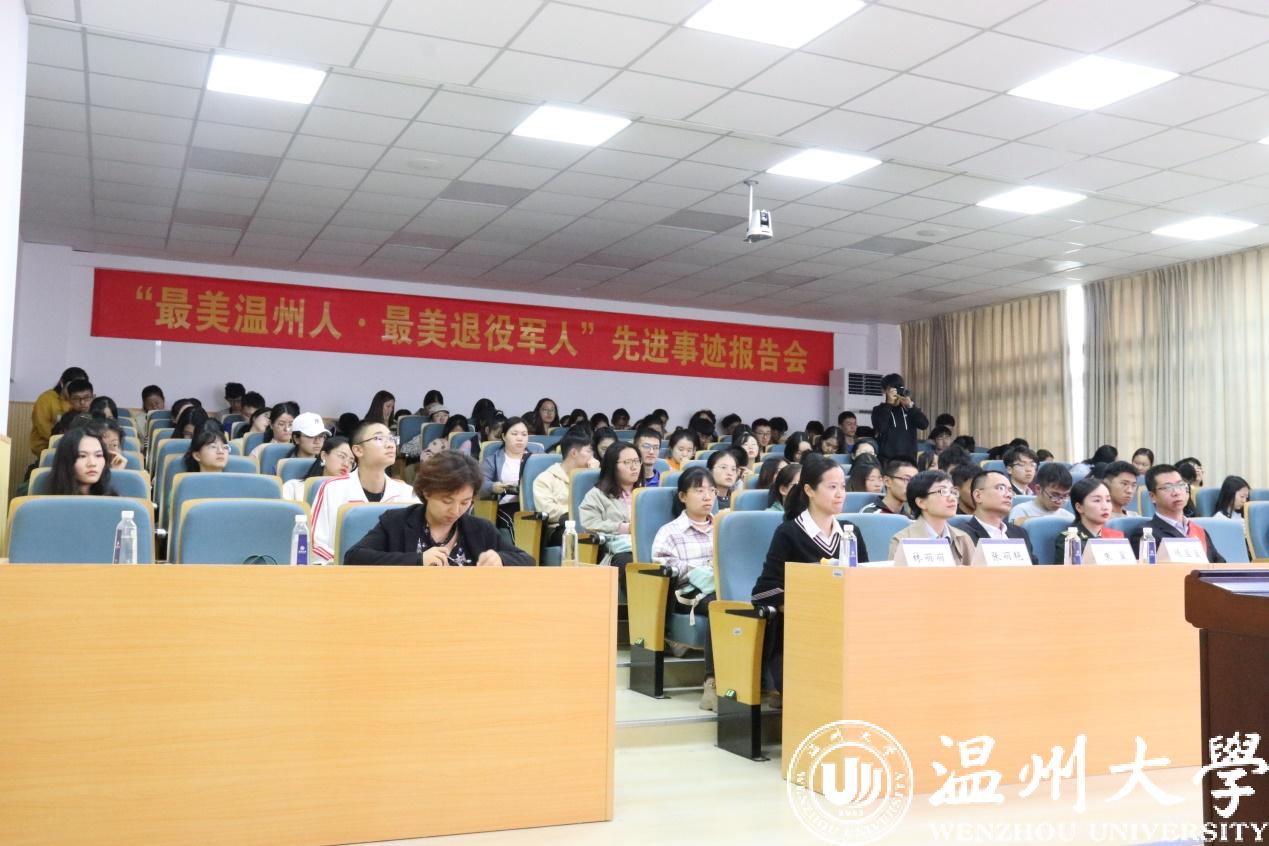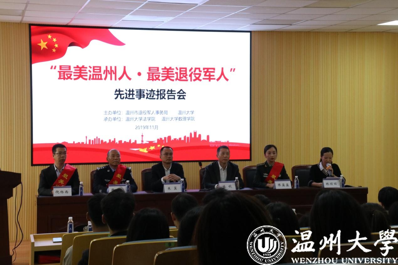 11月13日下午,由温州市退役军人事务局、麻将胡了试玩 、数理麻将胡了试玩 联合主办的“最美温州人·最美退役军人”先进事迹报告会在麻将胡了试玩 楼301报告厅举行。温州市退伍军人事务局党组成员、副局长朱翼、麻将胡了试玩 党委书记林钦、最美退伍军人周跃南、倪杨西、陈盈盈、数理麻将胡了试玩 学工办主任张丽艳、温州市退伍军人事务局工作人员出席本次报告会。本次报告会由麻将胡了试玩 学工办主任林丽丽主持。麻将胡了试玩 、数理麻将胡了试玩 全体学生党员参加报告会。