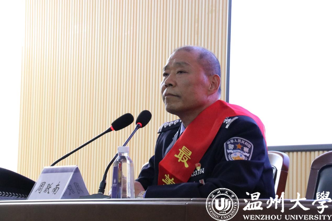首先,温州市退役军人事务局党组成员、副局长朱翼作讲话。他指出,温州是一片具有光荣革命传统的热土,是一座具有双拥优良传统的光荣城市。他提到,温州最美退役军人充分展示我市广大退役军人积极作为、自强不息的精神风貌,在驻温部队官兵和广大退役军人中引起不忘初心、牢记使命,争当先进的的意识和行动自觉。他希望全体学生从先进典型身上汲取精神营养,明确发展方向,以更高的标准要求自己,他对青年大学生提出三点希望:第一,胸怀祖国,存爱国之情;第二,敢于担当,聚爱国之力;第三,锤炼品德,养爱国之心;第四,练真本领,撑爱国之行。