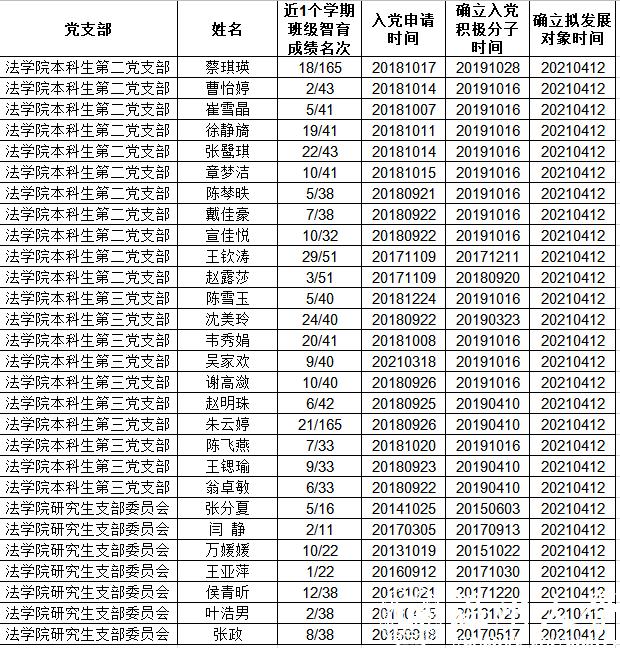 根据《温州大学学生党员发展具体标准(2020年修订)》,经过量化考核、民主测评、党的理论知识考试、答辩考核、支部讨论等,推荐为发展对象提交麻将胡了试玩 党委备案后,拟确定蔡琪瑛等28位同志为发展对象。特予公示7天(自2021年4月13日起至4月19日止),如对蔡琪瑛等同志确定为拟发展对象有不同意见或反映有关问题者,在公示期内可来电、来信、来访的形式反映问题,以个人名义反映问题的提倡真实署名,联系支部书记或麻将胡了试玩 学工办2-117办公室林老师,电话:0577-86680918,邮箱:[email protected]。
