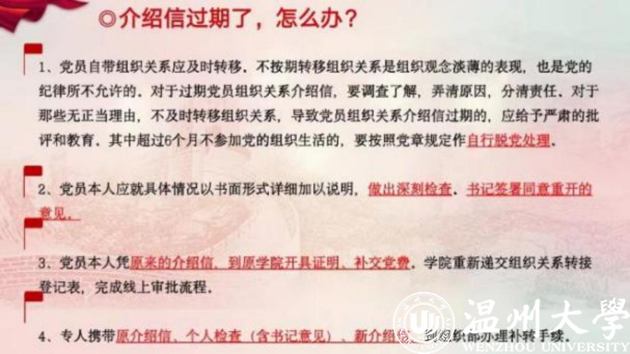 会议的第三项议程,由李明静同志针对转接需要开具纸质介绍信的同学具体讲述党员组织关系接转的要求和注意事项。李明静同志强调各位党员需要注意转交的流程和时间点,对于预备党员毕业留校后,必须积极、主动地与组织关系所转往的党支部保持联系,使党组织能够及时了解掌握其情况,并继续对其进行教育和考察,以确保其能如期转正。会议的最后,李明静同志总结了组织关系转接中易出现的四个问题,包括介绍信过期、介绍信丢失、介绍信开错、更改去向等问题并指出正确的应对办法。同时提醒各位毕业生党员必须思想上重视、态度上端正、按照学校要求主动转接组织关系。