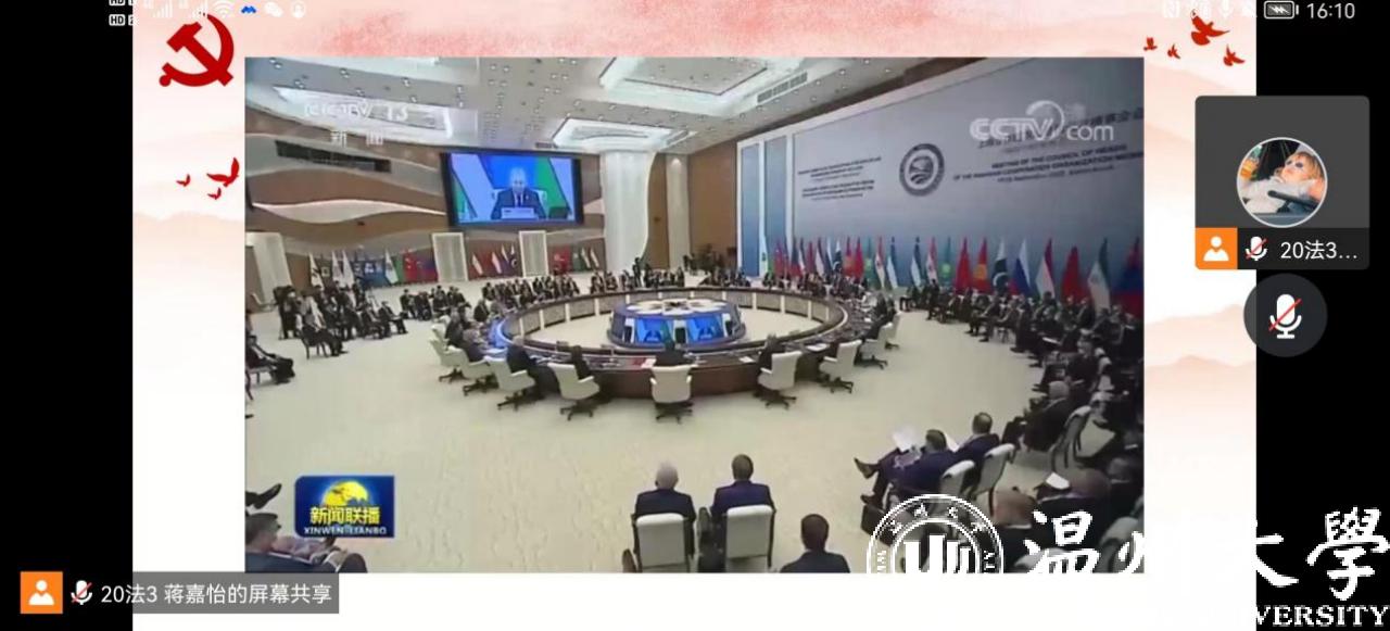 紧接着专题学习会第二部分为党员代表分享心得体会。代表党员将自己在浏览新闻、了解相关内容时的心得体会与全体党员作了分享,同时也表达了自己对“上合精神”的赞美与展望。第一党支部的贾若文、俞韬略同志通过理论与视频相结合的形式发表了自己的看法:上合组织顺应了和平、发展、合作、共赢的时代潮流,超越了冷战思维、零和博弈、文明冲突的陈旧观念,给予我们成功经验。第二党支部的吴萌萌、邵晴娅同志分享了他们的学习感悟:要坚持政治互信,坚持互利合作,坚持平等相待,坚持开放包容,坚持公平正义。第三支部的蒋嘉怡、杨道臻同志分享了自己的心得体会:我们应当积极践行“上海精神”,秉持“上海精神”一路前行,推动上海合作组织发展行稳致远,共同建设和平、稳定、繁荣美丽的美好家园。