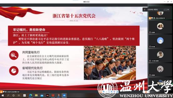 第二部分,浙江省第十五次党代会精神学习。浙江省作为共同富裕先行区和省域现代化先行区,要牢记嘱托,勇担新使命,要坚定不移沿着习近平总书记指引的道路奋勇前进。而作为新青年也要不忘初心、牢记使命,踔厉奋发,勇毅前行!
