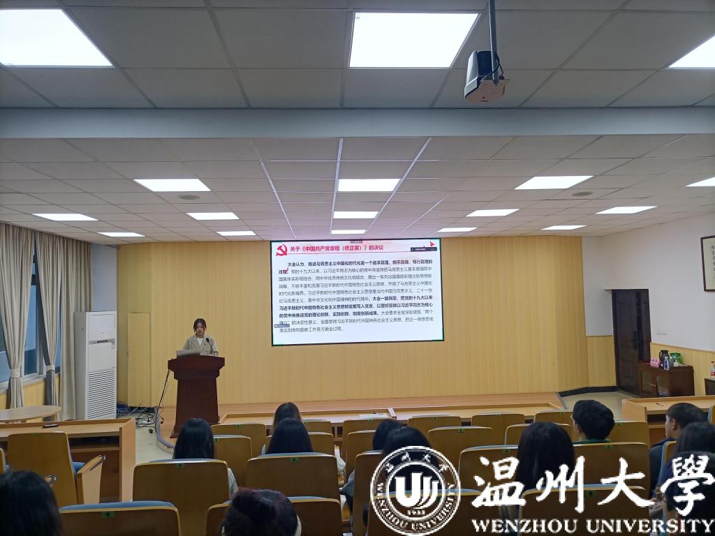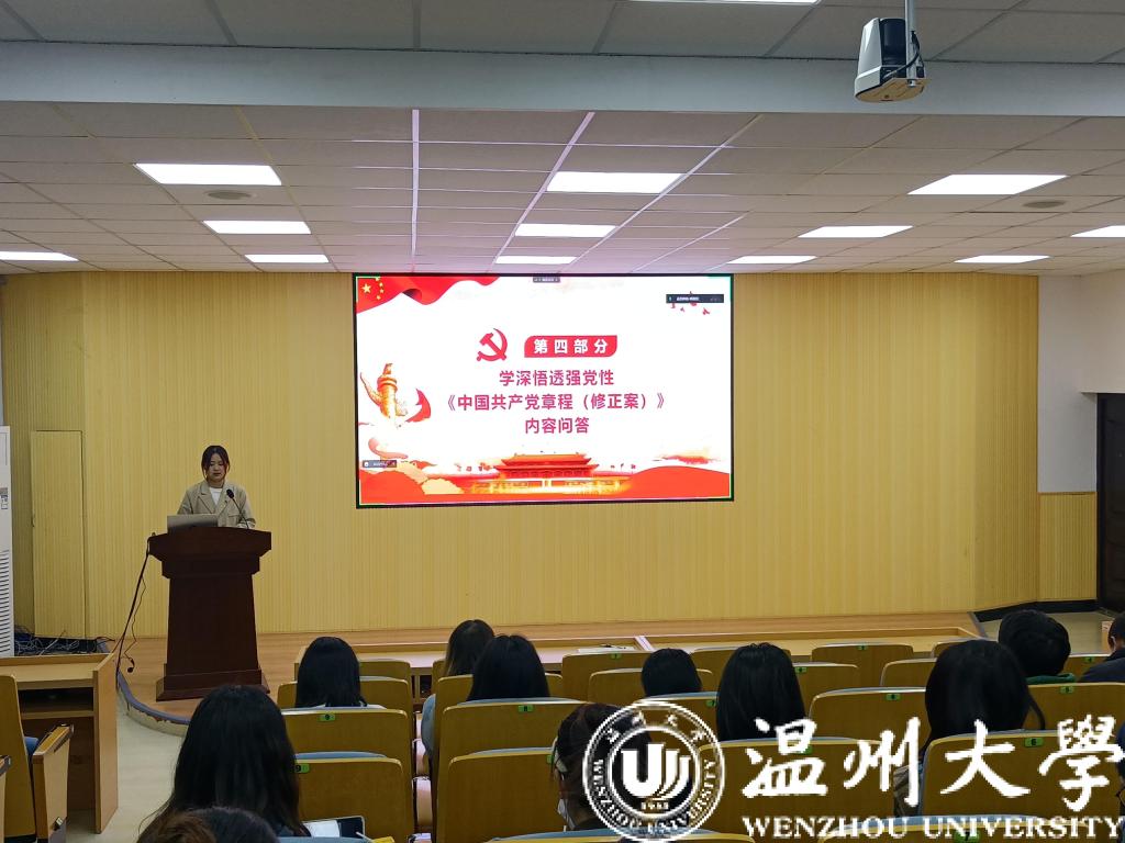 第一个议程,党员学习《中国共产党章程(修正案)》。在正式学习之前,支部全体党员重温入党誓词,全体起立,郑重宣誓。邱亚红同志带领党员集中学习党章知识。中国共产党是领导我们事业的领导核心,党的领导是实现中华民族伟大复兴的根本保证,通过学习,党员同志必将党章内容内化于心,外化于行。第二个议程,党章知识测试环节。在对《中国共产党章程(修正案)》进行学习之后,以知识问答的形式对支部党员同志进行测试,从“请你谈谈党的二十大为什么要修改党章”到“党章修改对我们学生党员的行为规范有哪些方面的影响”共十五题,党员同志们认真思考后积极作答,在学习中不断进步。