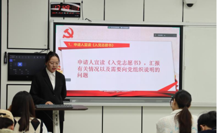由申请人宣读《入党志愿书》,汇报入党动机、自身履历与现实表现,以及自申请入党以来的思想理论学习情况以及组织工作生活情况,表达入党的期望和决心。