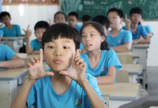 以十指为眼,以真情为音,手动千态,心传万声。2016年7月16日,"亲情中华"温州市侨界留守儿童第七季快乐营玉壶分营于大班开展了一节手语课。本次课程着眼于营员们对于手语的学习,聚焦于营员们的肢体表达能力,旨在让营员们接触全新的课程,述说一种与有声语言平行的语言,教授一门与人沟通的新语言,领略一项潜藏在生活的语言。