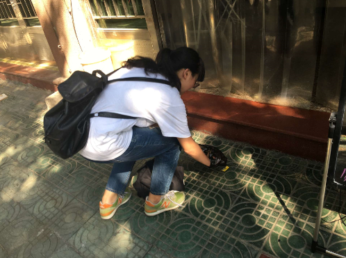 下午,我们分别到不同街道进行垃圾清扫的工作。首先,我们着重在城中街道进行垃圾清扫工作。城中街道位于中心地带,属于繁华街区,街道两旁有较大数目的餐饮店并设立了贩菜区,人流量较大,每隔一定的距离有环卫工人定时打扫街边垃圾。然而,我们发现最为严重的问题为街道旁均有烟蒂的丢弃。城中街道的路两旁为砖组成,每块砖有规则的纹路,因此烟蒂往往"藏"于砖的缝中,环卫工人清扫时容易忽视,队员们只能用手将烟蒂放在塑料袋中,据队员的不完全统计,500米长的街道有50余个烟蒂。行人通常将垃圾扔于树下与房屋门口处等不易于环卫工人开展清洁工作的地方。
