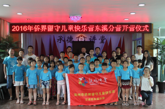 2016年7月11日上午九点,"亲情中华"温州市侨界留守儿童第七季快乐营东溪分营开营仪式于东溪社区综合文化站礼堂开展。全场气氛庄严,掌声热烈。出席本次开营仪式的领导有玉壶镇长王任、东溪社区领导胡一俊,毛东东,东溪小学校长罗鸿骥。主持人由罗校长担任。
