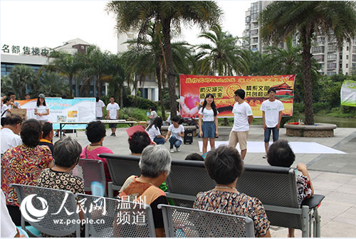 人民网温州7月15日电 7月13日,温州大学星之火防灾减灾教育志愿者协会暑期社会实践队走进瓯海区新桥街道西湖社区,开展防灾减灾宣传教育和应急培训活动。志愿者们将防灾减灾知识技能融入文艺节目之中,使参与活动的居民在看表演的同时,提高了防灾减灾意识和能力。