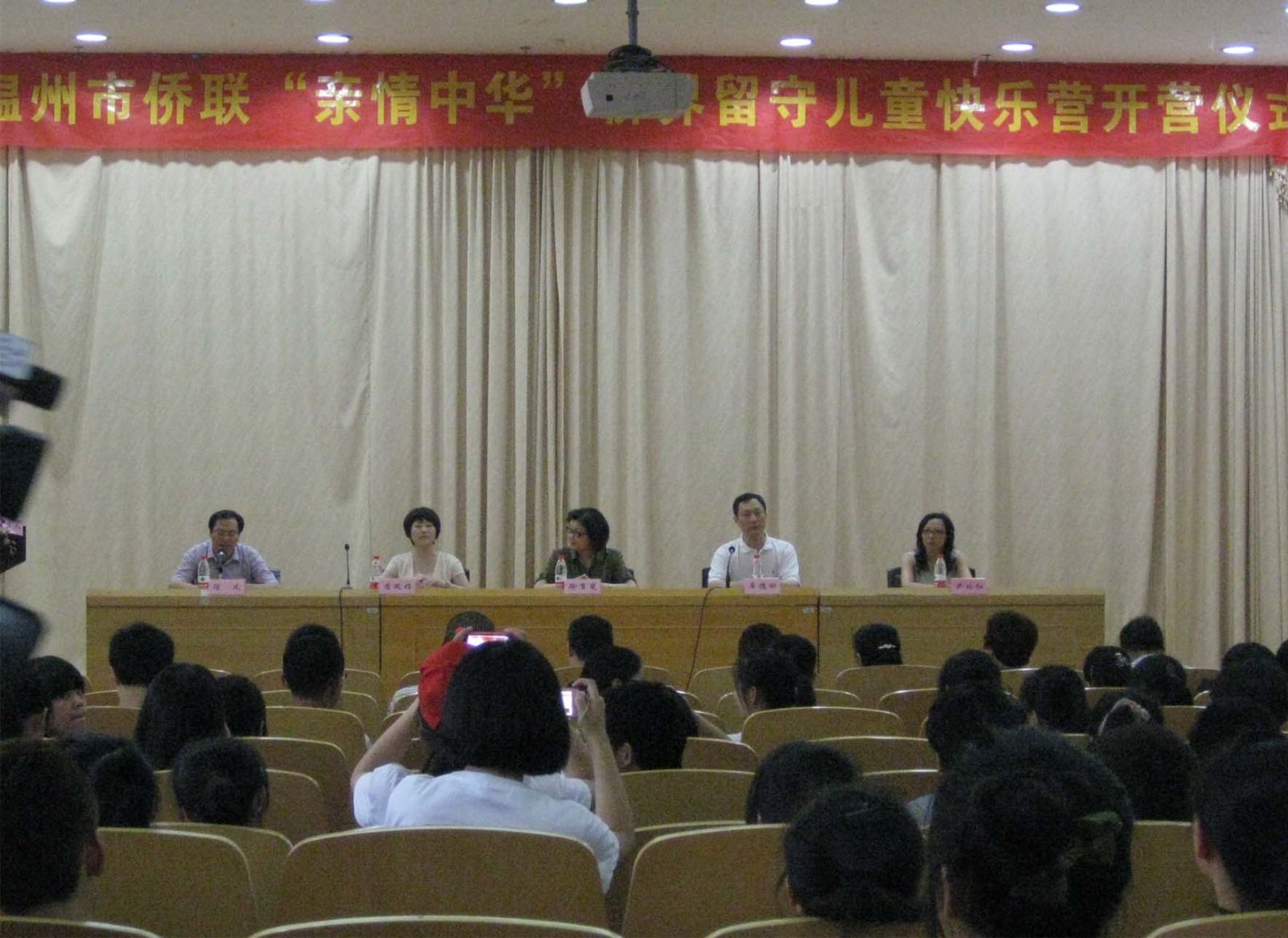 7月2号上午九点,温州市侨联"亲情中华"侨界留守儿童快乐营在温州大学会展中心雁山厅举行了盛大的开营仪式。在开营仪式中,温州市侨联党委副书记应凤娟书记为我们说明了本次组织的形式及规模,强调了在这个过程中我们所需的责任、合作、安全意识;温州大学副书记牟德刚老师也对本次活动的举行意义做出了强调。整个过程中,同学们认真听讲,并为本次活动做好充分的心理准备。