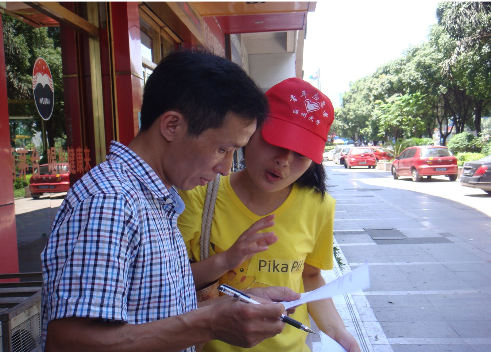 烈日当头,但队员们的热情丝毫不减。首先,队员们来到一条街道,向不同年龄层次的路人分发问卷。不少路人反映并不是很熟悉温州海岸开发包括海涂围垦等情况,于是队员们对此耐心解释,并以发问的方式一步步引导他们进入正题,由此顺利完成问卷。在这一过程中,队员们既向民众普及了海岸开发知识,又得到了他们的宝贵意见,可谓一举两得。但也有不少民众对此了解很多,表示十分愿意并荣幸能参与问卷,以表自己的心声。考虑到火车站候车室人流量大,接着队员们纷纷前往此地,以收集更具代表的意见。队员们先是简略地向民众说明自己的身份以及目的,大部分民众欣然接受问卷。其中,有不少关心政治及环保的民众,不仅完成了问卷,更是抒发了自己对政府进行海涂围垦这一举措的看法,包括经济效益与环境影响,还提出了自己的建议。