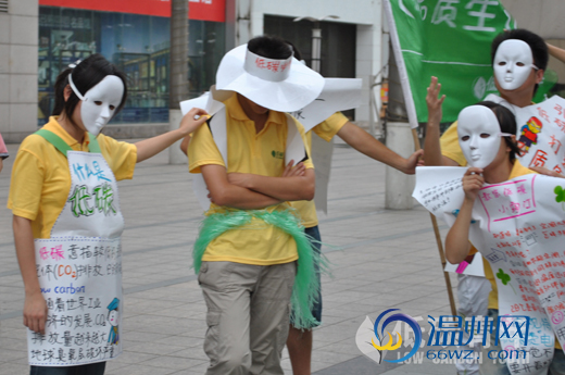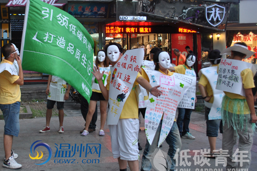 近日,温州大学"低碳青年"暑期实践队走上温州街头,展示"低碳"行为艺术。希望通过本次活动能够让更多的人认识"低碳",走近"低碳"。