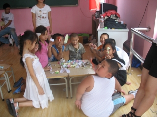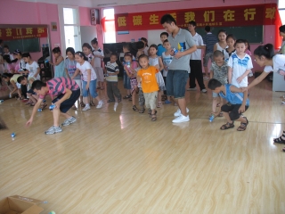 又是一个清晨,队员们一个个精神饱满地走进了那间熟悉的教室,新一天的活动马上有序地开展了起来。做好活动的前期准备之后,在孩子们期待的笑声中,"气球夹夹乐"游戏便开始了。队员和孩子们在游戏中学会了相互帮助。每一个小组就像一个实践队一样是个整体,成员之间密不可分。接下来的活动也是精彩连连。队员们利用空瓶子和空箱子做"空中投蓝"游戏的道具,通过这个小小的游戏来增强孩子们的环保意识,让孩子们从我做起,从小事做起,一点一滴保护我们共同的环境。投完空瓶之后,队员和孩子们又共同参加了一个名叫"贴膏药"的游戏。看着队员们和孩子们快乐奔跑的身影,每个人脸上都露出了灿烂的笑容。下午的活动也是非常有意义,是一个折纸比赛。在队员们的帮助和指导下孩子们发挥想象积极动手做出了许多有趣的小玩意如飞机、纸船、桃子、青蛙……最后每个队轮流进行了展示。