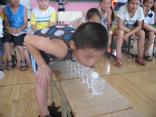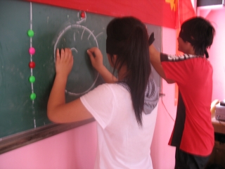 在今天的实践中,为了弥补活动中存在的缺陷,提高活动质量,队员们提前了半个小时来到实践基地对接下来的活动进行了讨论并制定了相应的计划。第一个活动是"蒙眼过线"游戏,由一个人指挥另一个蒙着眼的人穿过障碍线到达目的地。这个活动最主要的意义就是让孩子们在游戏中学会互相信任,互相帮助。紧接着"蒙眼画人像"的游戏又拉开了序幕。队员和孩子们都积极参与进来,玩得很尽兴,教室里充满了欢声笑语,其乐融融。最有趣的游戏要数"水中吹乒乓",它实行积分制,四个小组很快便展开了激烈的角逐,每个组都不甘落后。队员们分工明确,有的在记录得分,有的在维持纪律,也有的在擦除地上的积水……为了强健孩子们的体魄,下午队员们举办了一个大型活动---拔河比赛。因为下雨,所以比赛的地点选在室内,但每个孩子都相当得活跃,使出浑身解数。课间休息过后,一批参加朗诵比赛的同学在队员的指导下练习诵读诗篇,还有一批同学在队员的辅导下安静地在教室里写作业。