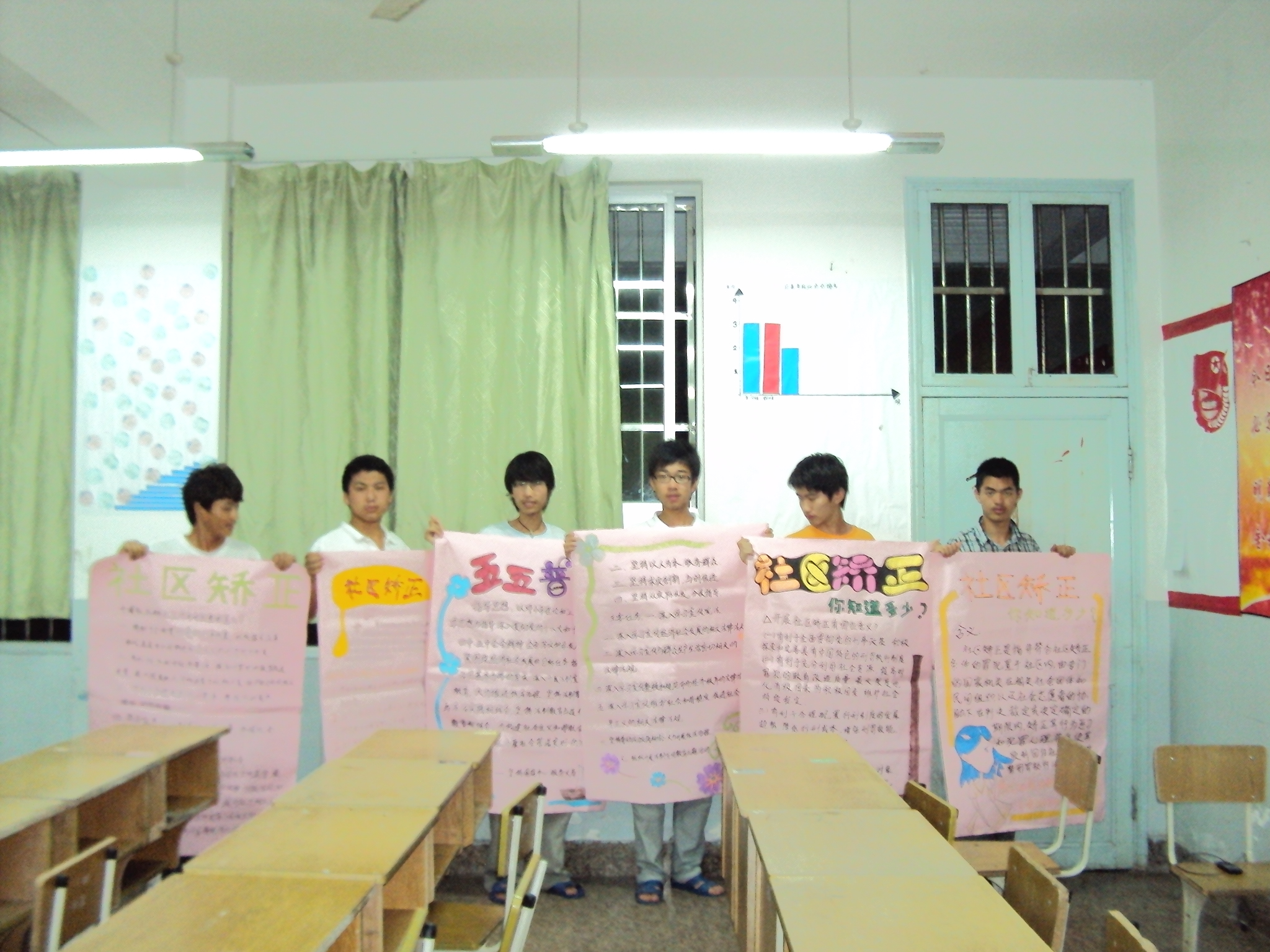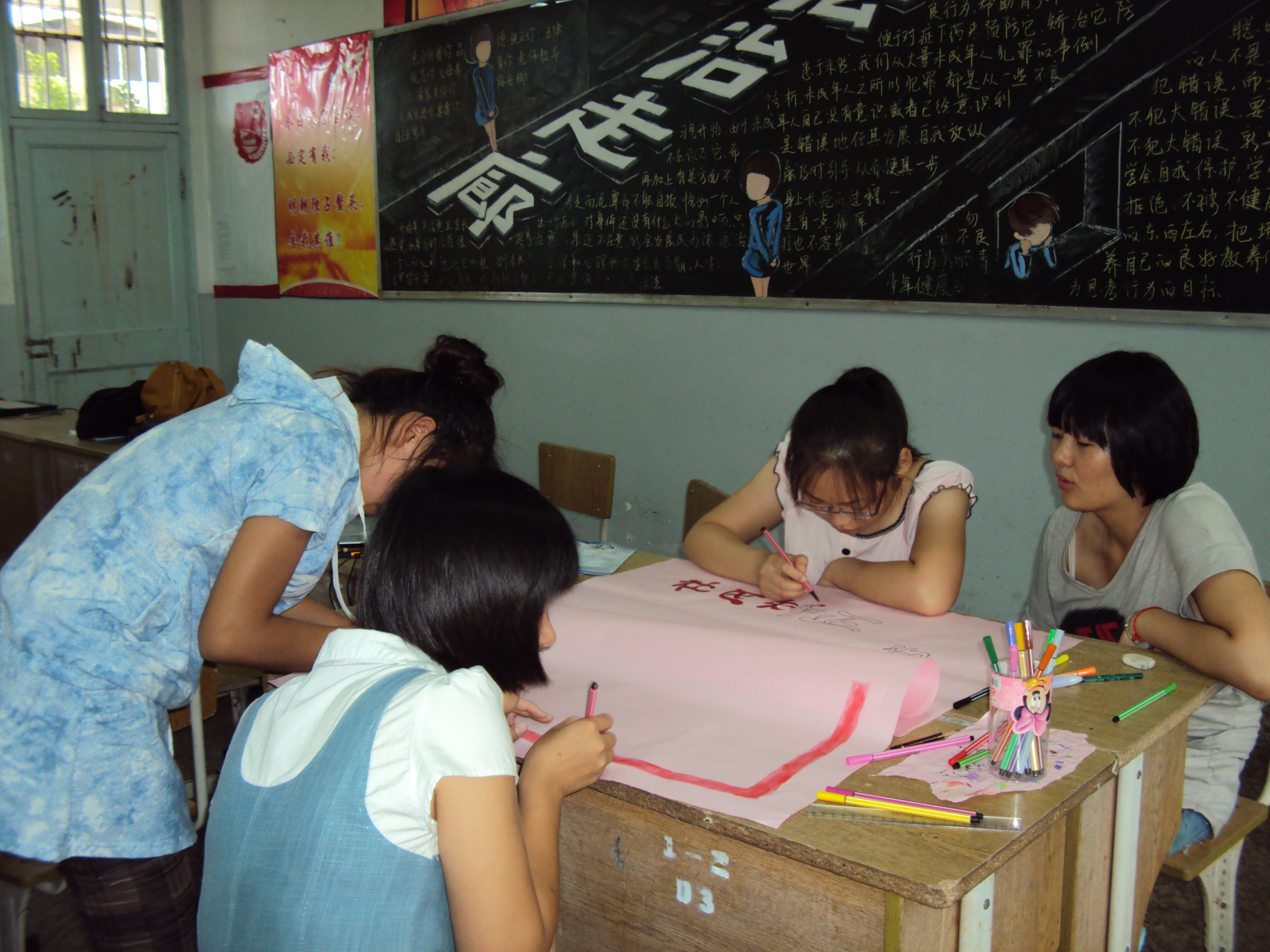 在洞头一中的一个空教室,16个队员聚在了一起。一阵阵的欢声笑语里,同学们齐动手一笔一画的书写、勾画。没有高超的绘画技术,就用创意弥补;没有好的海报纸、画笔、水彩,就用细致和漂亮的书写来增分;没有凉意空调,没有清凉冷饮,有的是队员们的一片热心,为社区矫正,为这个社会的弱势群体献上自己的一份心。