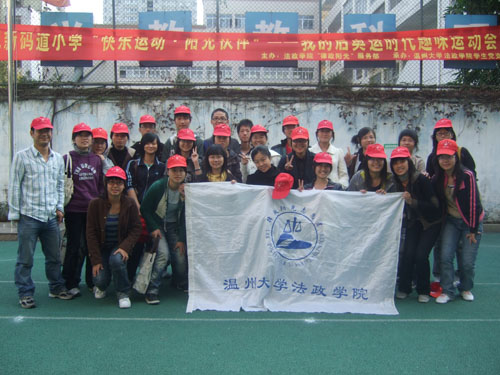 08年11月26日下午1:30,温州大学法政麻将胡了试玩 "律政阳光"志愿者服务部以及院学生党支部的志愿者们,走进了一个特殊的学校——温州市新码道学校。在那个充满爱的地方,志愿者们满载着关心与爱心,为那里的智障儿童举办了一场以"快乐运动 阳光伙伴——我的后奥运时代"为主题的趣味运动会。