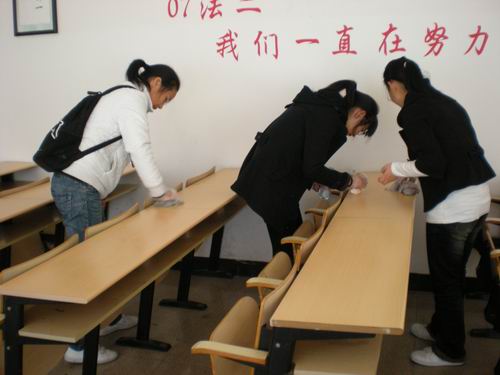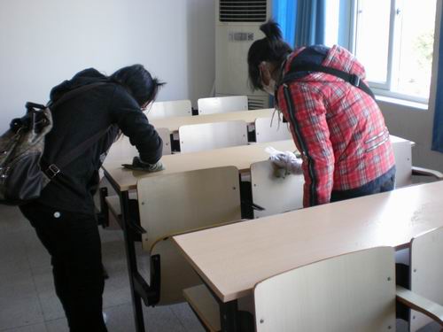 首先,所有人员在2-111教室集合,由校文明督察队员为志愿者们按步骤讲解了如何使用橡胶水清洗桌面,同时也提醒志愿者注意自身安全,避免身体直接触碰橡胶水造成伤害。随后,在青年志愿者服务部人员向志愿者分发了手套、抹布、橡胶水等物品进入到各个教室内进行清理。在浓烈刺鼻的气味中,志愿者们没有抱怨有条不紊地擦拭着桌面,每一张桌子在经受一番"洗礼"之后都焕然一新,在阳光的照耀下泛出明亮的光彩。